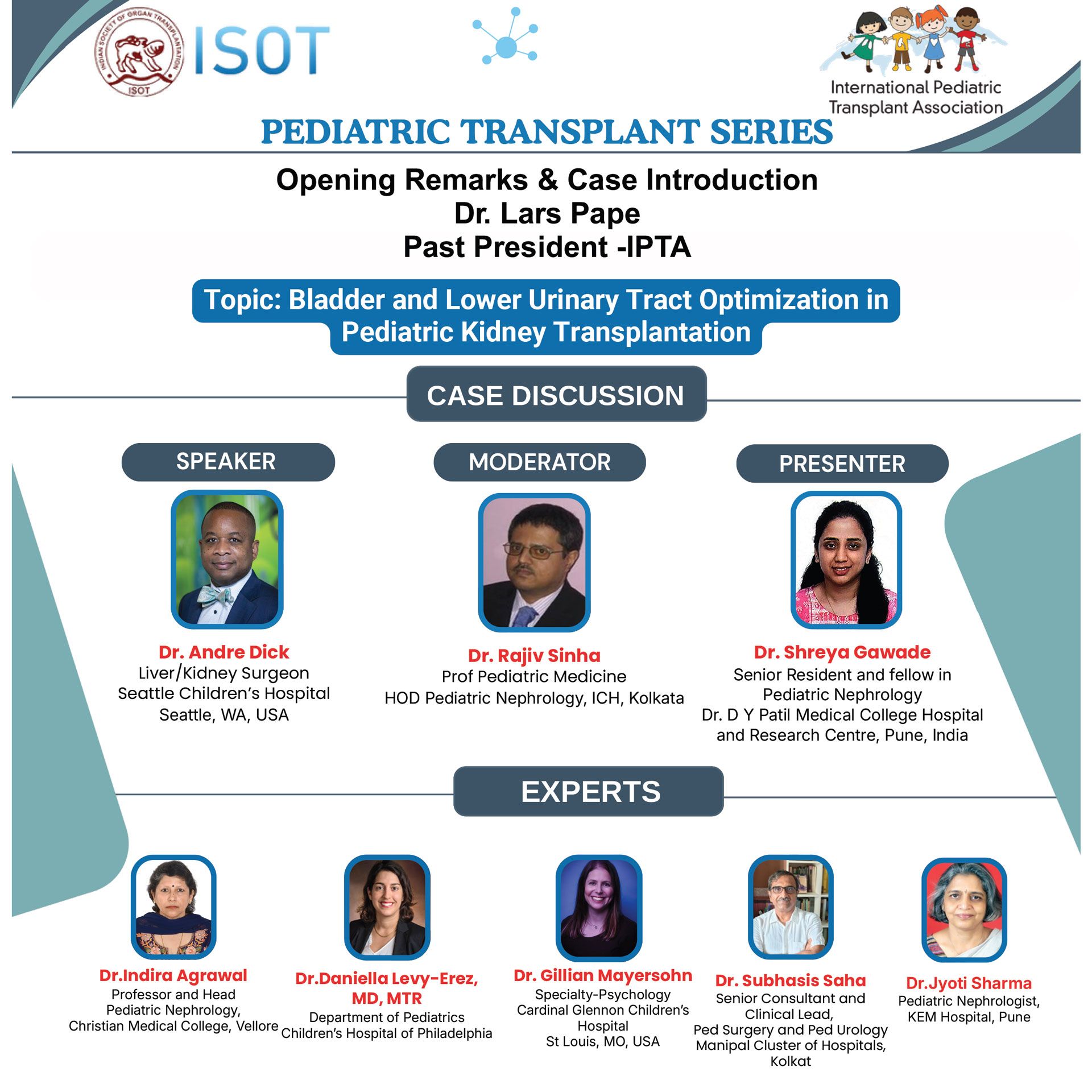The next webinar in our series will take place on Friday 20th March at 18:30pm IST (Indian Standard Time) and is entitled ‘Bladder and Lower Urinary Tract Optimization in Pediatric Kidney Transplantation’, presented by Dr. Andre Dick, Seattle Children's Hospital, USA; and Dr. Shreya Gawadem, Dr. D Y Patil Medical College Hospital and Research Centre, India. Opening remarks and case introduction by Dr. Lars Pape, IPTA Past-President.